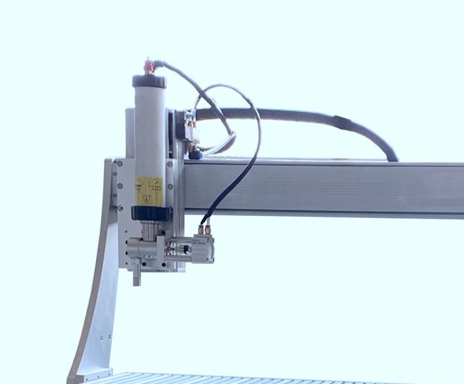 將待香蕉草莓视频產品通過工裝治具放置於操作平台上,三軸運動控製係統控製香蕉草莓视频頭按設定程序運動,同時壓縮空氣將膠水按設定量準確的塗覆在產品表麵所需要的位置。
